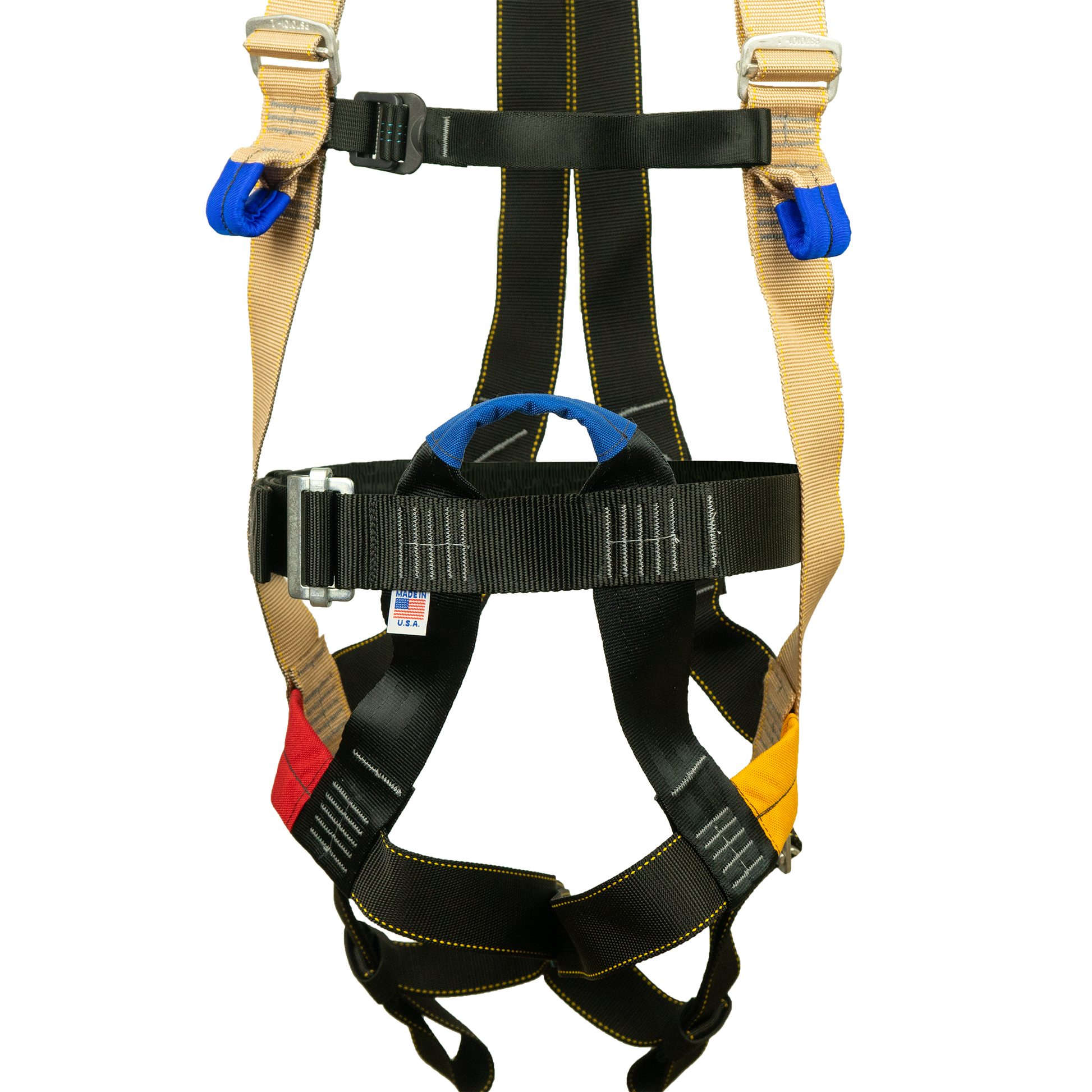 The Full Body Harness is a Class III type safety harness with both front and dorsal attachment options. Strength rated to 3,600 lbs. (16 kN), the Full Body features quick-adjust buckles, three point front tie-in and forged steel alloy rear D-ring for dorsal attachment. Constructed using US sourced nylon webbing, bonded nylon thread, and modern programmable bar tackers for optimum strength to weight ratio. Designed for challenge courses and zip lines where greater participant security and a dorsal attachment point is desired.